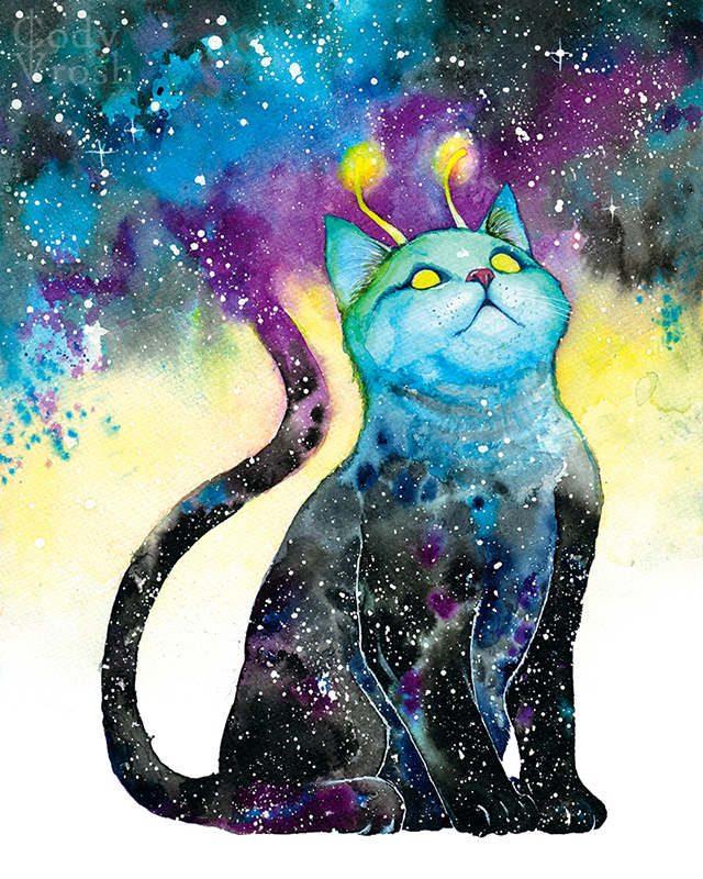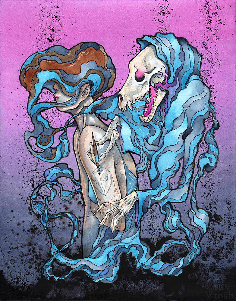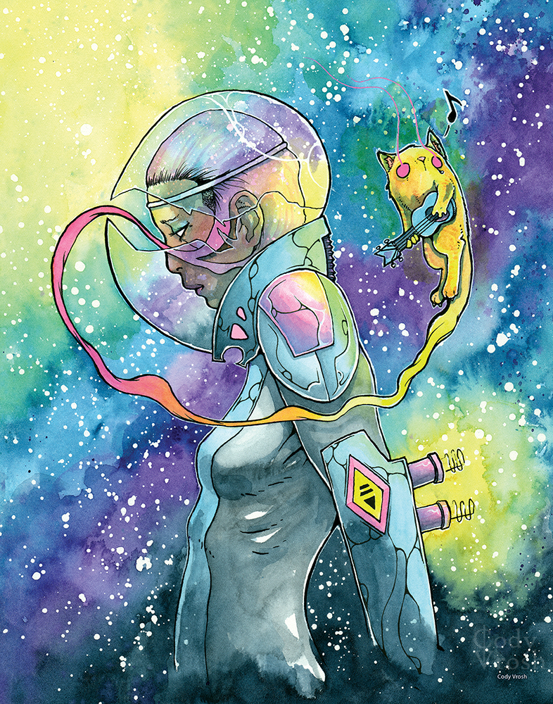 Cody Vrosh is a watercolor artist and illustrator, fusing science fiction & fantasy elements with bold characters and playful creatures to create unique speculative illustrations. He is the creator of COFFEE CREATURES and TEETH CREATURES. His work includes art for Sideshow Collectibles, Famous Monsters/American Gothic Press, and Printed in Blood. Cody’s current project is LITTLE SATELLITES, a collection of paintings of lost astronauts traveling the cosmos exploring themes of solitude and mortality.