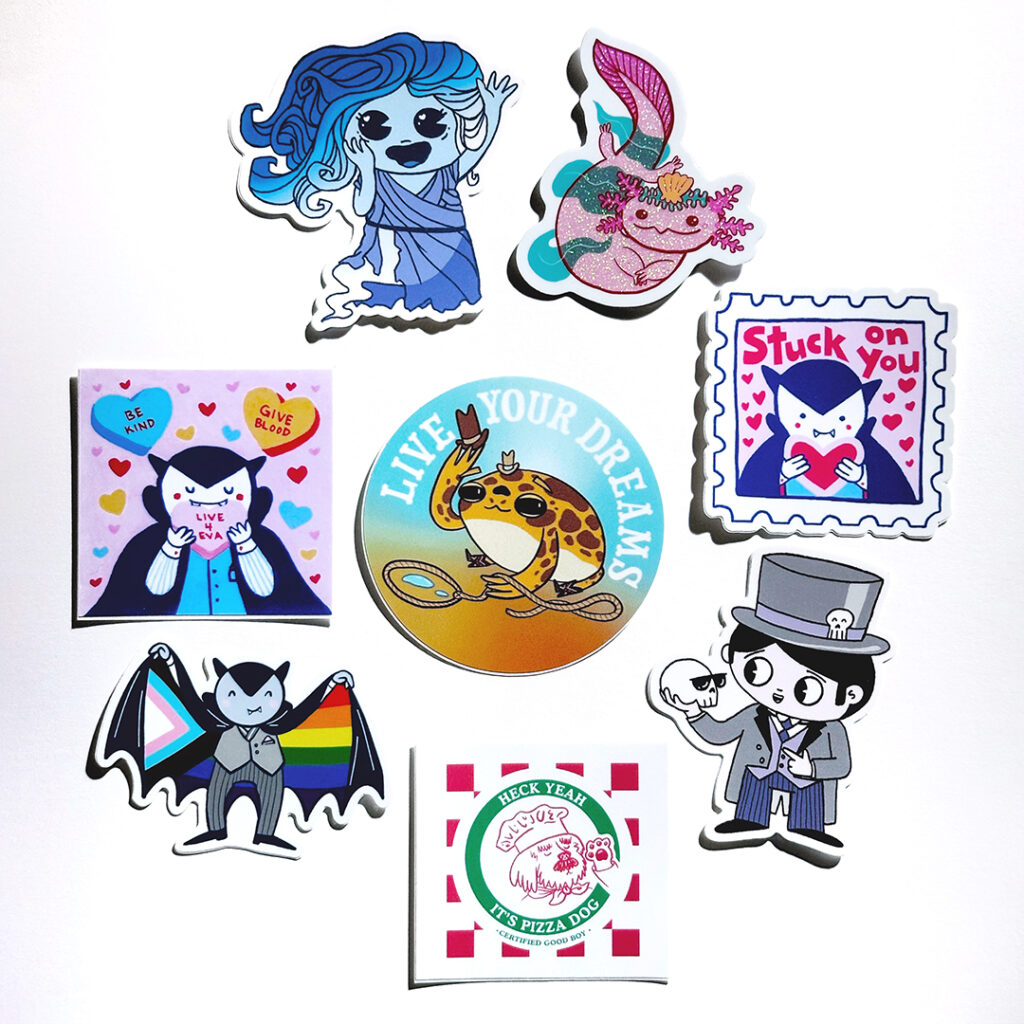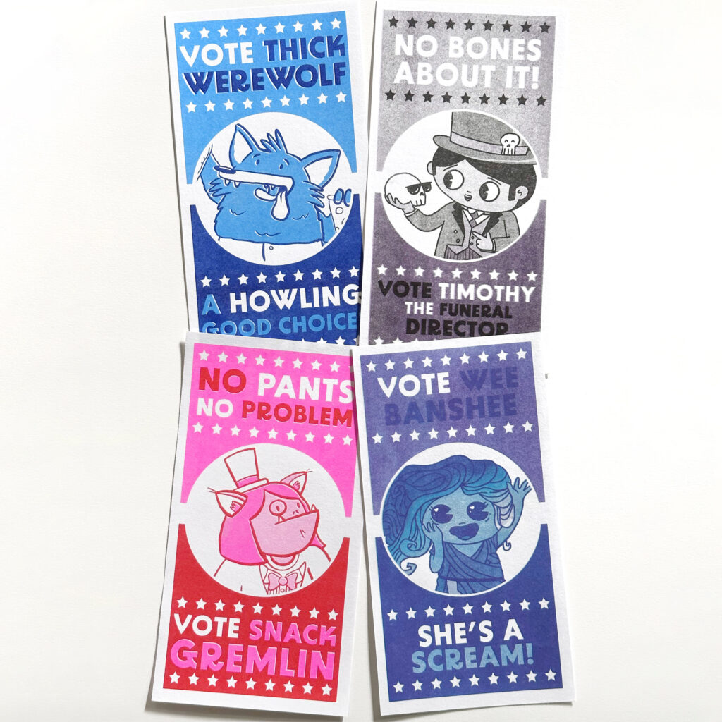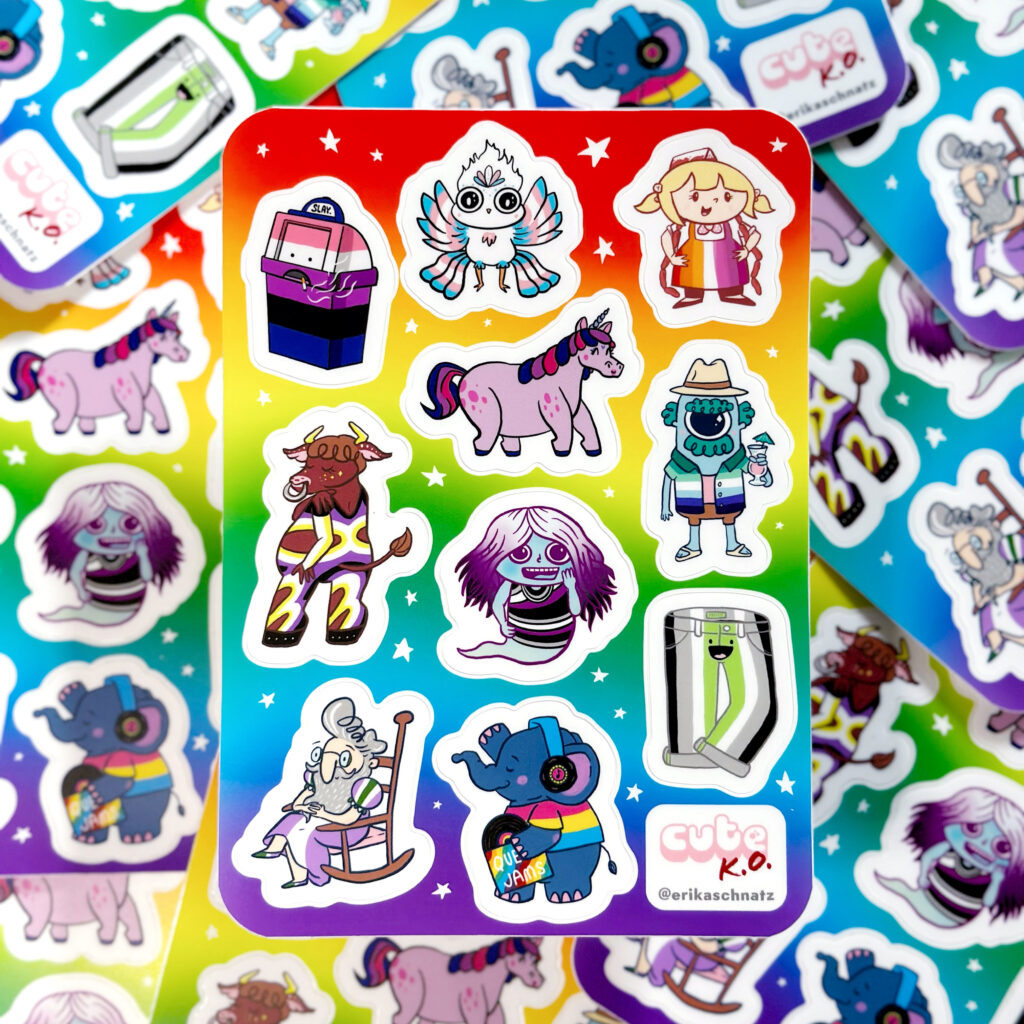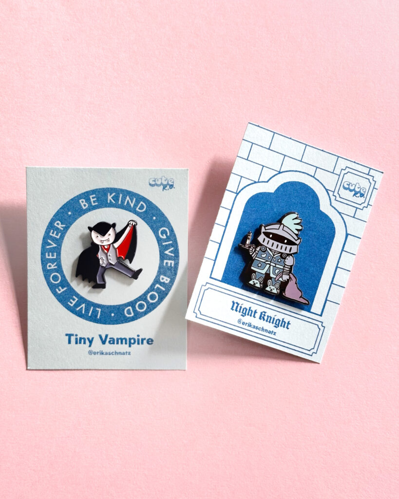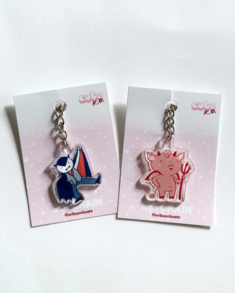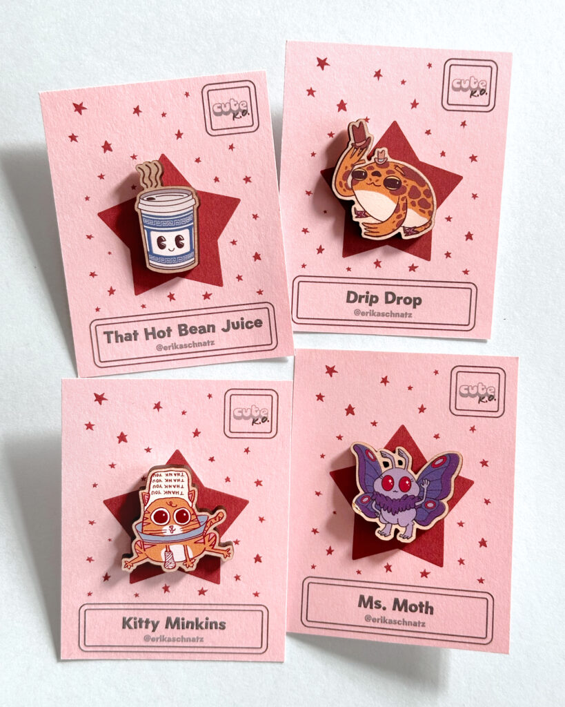 My name is Erika Schnatz and I run a participatory art project on social media at least once a year called Cute K.O., which is a cuteness tournament populated by original characters I create. The audience votes for their favorites in head-to-head matchups, and the tournament concludes when there is one cute champion remaining. I've made stickers, prints, pins, zines, buttons, keychains, and trading cards that tie in to the Cute K.O. universe. The keychain and pin packaging includes fun facts about the character, so folks get to take a little Cute K.O. lore home with them.